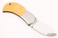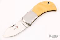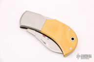 This knife by Al Mar Knives features a satin finished blade with nail nick. The handle has stainless steel bolsters, yellow paper micarta scales, brass liners and a stainless steel backspacer, lanyard hole at the butt.  Includes original box and papers. Excellent Condition.