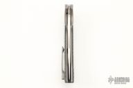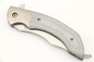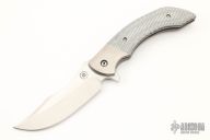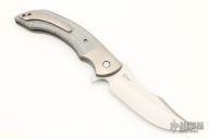 This XL Persian One Off flipper by David Mosier features a satin finished blade with notched thumbrest and flipper. The handle has orange peel finished titanium bolsters, silver twill scales, bead blasted titanium liners, black G-10 backspacer, tip up orange peel finished titanium clip. Nice smooth action and great lockup, detent and blade seating. Excellent condition. Comes with a zippered case.