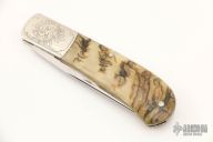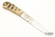 This slipjoint by RJ McDonald features a hand rub satin finished blade with nail nick. The handle has engraved and dovetailed nickel silver bolsters, sheep horn scales, nickel silver liners and stainless steel backspacer. The engraving is signed, "DMR R.J.R. ENG". Has a half-stop. Has some light scratches and some oxidation on the inside of the spring, otherwise excellent condition.