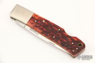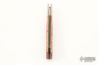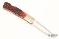 This Lockback folder by Frank Centofante features a hand rub satin finished drop point blade with nail nick and false top edge. The handle has nickel silver dovetailed bolsters and fileworked liners, jigged bone scales, stainless steel lockbar and black linen micarta backspacer. Has some light scratches, otherwise excellent condition.