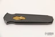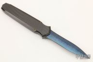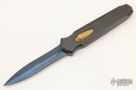 This Triton OTF by Jeff Harkins features a double edged Rob Thomas Nitre Blued Damascus blade. The handle has a black chromed aluminum chassis, 24kt gold plated screws, gold colored thumbslide with diamond set in gold bezel. Nice action. Comes with COA, One of a Kind. Comes with a zippered case.  Light scratches are visible on the blade and handle otherwise the knife is in good condition.