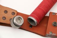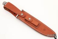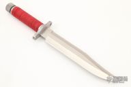 This SF-10 from Al Mar Knives is a large hollow handled survival knife with super sharp serrations on spine. 3/16" stock and 1 1/2" blade depth. Screw off handle cap and cord wrapped handle. Brown leather sheath with belt loop. Hard to find piece. This one comes with original wooden box and papers. Excellent condition. 25th Anniversary The Special Forces Green Berets