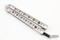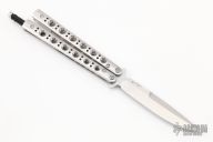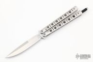 This Model 62 Balisong by Benchmade features a stonewashed spear point D2 blade with a false top edge. The handle has stainless steel handles and latch. Comes with original box, sheath and papers. Rubber rings on the T-latch are after market. Excellent condition.