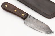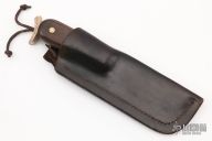 This skinner by ML Knives features a clip point blade with fileworked thumbrest, .126" blade stock and 1.785" blade depth, full tang construction. The handle has aged black walnut scales and brass pins over brass washers. Comes with a brown leather sheath dated 2013. Has a few light scratches, otherwise excellent condition.