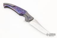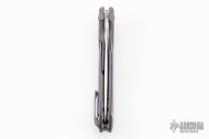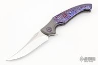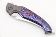 This Hydra Bolsterlock Flipper by Lee Lerman features a Damasteel blade with flipper. The handle has a bead blasted titanium frame with mokuti scales, pivot collars and floating backspacer, tip up bead blasted titanium clip with hidden screws. Rides on bearings, nice detent, lockup and blade seating. Excellent condition. Comes with a zippered case.