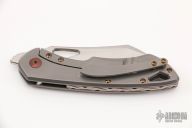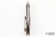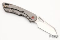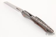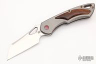 This Whippersnapper from Olamic Cutlery features a satin finished blade, thumbhole, notched thumbrest and front flipper. The titanium frame has a desert iron wood inlay, pocket clip is positioned for tip up carry, floating carved/anodized titanium backspacer. Blade is centered when closed and locks up with no play. Comes with maker's card with a serial number of WS526-W and dated 05/05/2021. Includes a padded zippered case. Excellent condition.