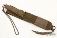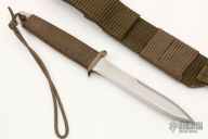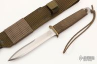 This EK knives Korea/WWII/Vietnam fighter features a satin finish surgical stainless steel double edge blade. 7/8" blade depth. Brass double guard. Green cord wrapped handle. Full tang construction. Nice classic feeling knife. Comes with Nylon sheath, original box and papers. Excellent condition.