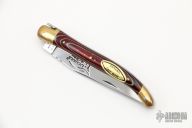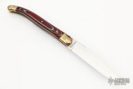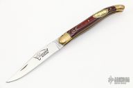 This knife features a mirror polished clip point blade with a single nail nick and a fileworked thumbrest. The handle features brass bolsters/liners over a steel backspring and wood covers. Fileworked backspring. Excellent Condition.