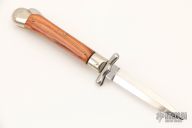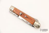This swing guard auto features a dagger style blade with a single nail nick. The handle has nickel silver bolsters over brass liners and wood scales. Excellent Condition.