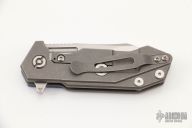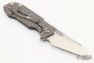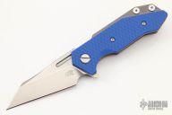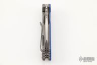 This Half Track from Hinderer Knives features a working finish blade with swedge, fullers, notched thumbrest and flipper. The handle is comprised of a tumbled titanium frame over barrel spacers with blue g10 scale. Titanium clip is positioned for tip up, right hand carry. Tri-Way pivot. Comes with original box and papers. Excellent condition.