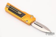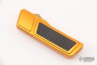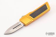 This Akuma OTF Auto by No Limit Knives features a satin finished double-edged blade with carbon fiber inlays. The handle has a gold aluminum frame with carbon fiber inlay sand a steel pocket clip. Comes with a zippered case. Excellent Condition.