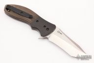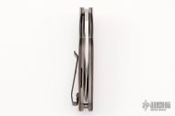 This Lambert Snap Flipper has a satin finished recurve blade. Handle has lightning strike carbon fiber bolsters, micarta scales, bead blasted titanium liners, titanium barrel spacers, and a black stainless steel tip up clip. Comes with nylon zippered case. Nice detent lock up and blade seating.  Excellent condition.