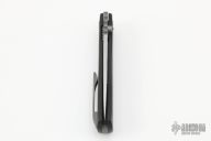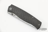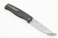 This Strizh by Alexander Cheberkov features a Damascus blade with notched thumbrest and a single thumbstud. The handle has a carbon fiber frame with blasted hardware and inlaid liner, matching backspacer and tip up clip with hidden screws. Comes with original box and papers.  Excellent condition.