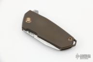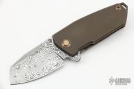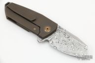 This Bulldog flipper by Alexander Churburkov features a Damascus blade with notched flipper. The handle has an anodized titanium frame, backspacer with lanyard hole and tip up clip with hidden screws. Has stainless lockface insert, rides on bearings, nice detent, lockup and blade seating. Includes original box and papers.  Excellent Condition.
