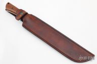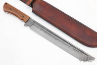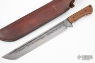 This Chopper Short Sword by Hammer Down Forge features a tanto blade with nice hamon and fullers, .256" blade stock and 1.681" blade depth, full tang construction with Thunderstorm Kevlar scales and black G-10 liners. Comes with a brown leather sheath. Excellent condition.