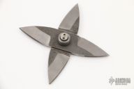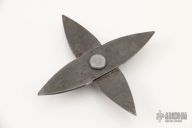This Folding 4-Point Shuriken by Blossom Blade features bead blasted chisel ground blades that pivot and lock open. Push the button and pivot them back to fit them in the black leather sheath with belt clip. Has some light scuffs, otherwise excellent condition.