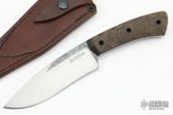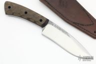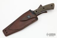 This knife by E. Scott McGhee of Guinea Hog Forge features a hand forged blade with false top edge, .246" blade stock and 1.615" blade depth, full tapered tang construction. The handle has contoured black linen micarta scales. Includes a brown leather sheath. Excellent condition.