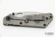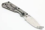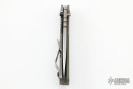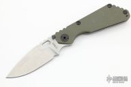 This Strider SNG framelock folder features a stonewashed blade with thumbhole and notched thumbrest. The handle has a green G-10 and stonewashed titanium frame with titanium clip, tip up carry. Jimping on blade spine. Nice lockup, detent, and blade seating. Has a few light scratches, otherwise good condition.