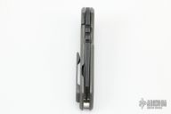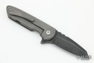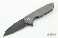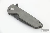This Small Arrester by Brad Blount features a dark tumble finished blade with a notched thumbrest and flipper. The handle has a tumbled titanium frame with a matching tip up clip over, barrel spacer and lanyard pin. Nice blade seating, detent and lock up. Comes with a felt case. Excellent condition.