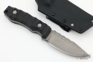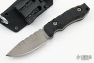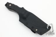 This knife by Raid Ops features a textured titanium blade with notched thumb rest, .185" blade stock and 1.111" blade depth, full tang construction with black G-10 scales. Includes a kydex sheath with a small TekLok. Excellent condition.