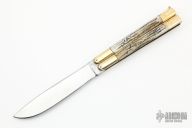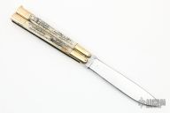 This balisong from the Philippines features a drop point blade with a satin polished blade. The handle has brass bolsters, brass channel/liners, jigged bone scales, brass T-latch. Has some scratches, otherwise good condition.