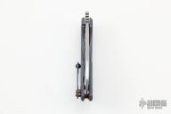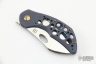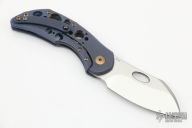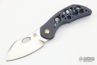 This Busker by Olamic Cutlery features a satin finished sheepsfoot style blade with a swedge thumb hole and notched front flipper. The handle has a Kinetic Ocean finished titanium frame with a matching tip up clip, bronzed hardware and pivot. Includes original padded case and makers card dated 09-04-2019. Excellent Condition.