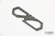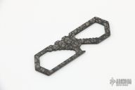 "Made of anodized titanium, this compact multi wrench tool features seven SAE wrench sizes: 1/4, 5/16, 3/8, 7/16, 1/2, 9/16, and 5/8. Also includes seven Metric wrench sizes: 6, 8, 10, 12, 14, 16, and 18mm. A bottle opener with additional 5/16 wrench opening completes the tool." Has a "DLC Patterned" finish and is one of a kind. Excellent condition. Comes with original bag and card.