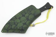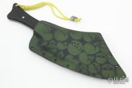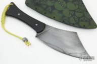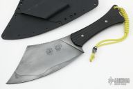 This Cannibal Combat Cleaver by Van Steck is a Laci Szabo design and features a cleaver style blade with a nice hamon and fileworked spine, .228" blade stock, 3.612" blade depth, full tang construction. The handle has  with textured black paper micarta slabs. Includes a kydex sheath. Excellent condition.