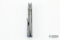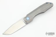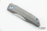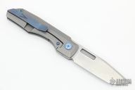 This Impulse Mini by Vero Engineering features a stone wash finished blade with notched thumbrest and flipper. The handle has a tumbled titanium frame with satin titanium hardware, matching tip up clip with hidden screws and backspacer. Nice detent, lockup and blade seating. Comes with a zippered case and COA. Has some scratches on the clip and frame, otherwise excellent condition. #165.
