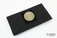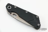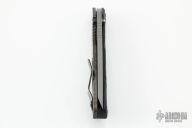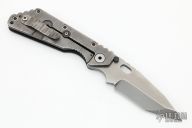 This Duane Dwyer Custom SMF features a chisel ground blade with thumb hole and dual studs. Striped titanium handle with a black G-10 front. Titanium clip. Notches on thumbrest, rear of handle, and lockup. Includes Hinderer "Lock Bar Stabilizer" for maximum reverse lock retention. Nice detent, lockup and blade seating. Has some light scratches on the frame, otherwise excellent condition.