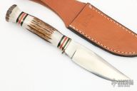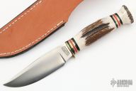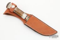 This Handy by Marbles features a satin finished blade, .214" blade stock and 1.195" blade depth, hidden tang construction. The handle has a brass guard with a stag grip and black/brass/white/red spacers and stag butt cap. Comes with original box and brown leather sheath. Excellent condition.