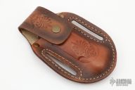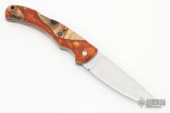 This lockback by Hayta Knives features a satin finished blade with nail nick. The handle has hybrid wood scales, stainless steel liners with fileworked spines and a stainless steel backspacer. Comes with a hand tooled brown leather sheath. New from maker.