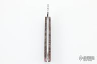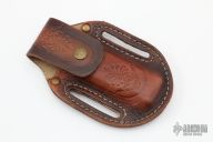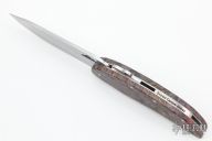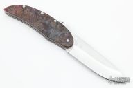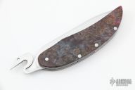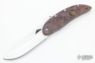 This friction folder by Everest Custom Knives features a mirror polished blade. The handle has burl wood scales, stainless steel liners and backspacer. Comes with a hand tooled brown leather sheath. Has some scratches on the blade. New from maker.