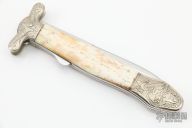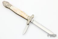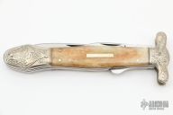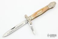This knife by Parker Cutlery has "Liberty and Union" engraved on the blade. Nickel silver bolsters, gone scales, brass liners, stainless steel springs. The large blade is a lockback and the small blade is a slipjoint. Excellent condition.