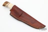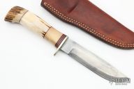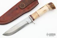 This Hunter by Morseth Knives features a satin finished laminated blade with .170" blade stock and 1.025" blade depth, hidden tang construction. The handle has a nickel silver guard, stag grip with red/white/black spacer pattern. Comes with a brown leather sheath. Has some light scratches and patina, has been resharpened, otherwise good condition. Dated 1995 and made by Bob Dozier