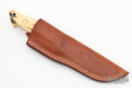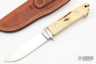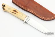 This clip point hunter by WC Davis features a mirror polished clip point blade, .203" blade thickness and .959" blade depth, full tapered tang construction. The handle has a nickel silver guard, stag scales with red liners/spacers. Comes with brown leather sheath. Has some light scratches, otherwise excellent condition.
