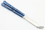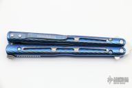This Model 51 Morpho Balisong from Benchmade has a stonewashed clip point blade, blade has been reground by Steve Marcuzzo and it looks awesome! Handle has anodized titanium scales that were an EDC Knives run of Chevron milled titanium, with anodized and jeweled titanium liners and clip. Comes with drawstring pouch. Excellent condition.