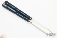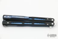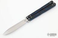 This Model 51 Morpho Balisong from Benchmade has a stonewash finished D2 stainless steel spear point blade. Handle is black G10 with blue jeweled/ anodized titanium liners and blue anodized titanium tip up clip. Excellent condition. Comes with original box and papers.