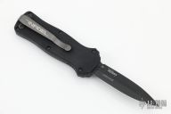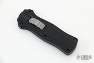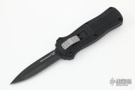 This 3350 Mini-Infidel by Benchmade features a black double edge dagger style D2 blade with fullers. The handle is comprised of a black anodized aluminum frame, ramped steel thumb slide and steel tip down clip. Excellent Condition. Comes with original box, sheath and papers.