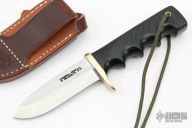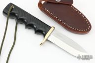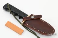 The Fireman Special by Randall is a non-catalog model with an extra-heavy beveled blade with 229" blade stock and 1.187" blade depth. This knife has a 4" stainless steel blade with notched thumbrest, brass guard, and a finger grip black linen micarta grip, full tang construction. Comes with a brown leather sheath and original paper wrapping. New from maker.