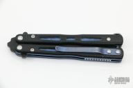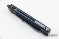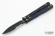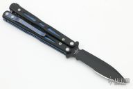 This Model 32 Morpho Balisong by Benchmade has a DLC spear point D2 stainless steel partially serrated blade. Handle is black G-10 with blue anodized titanium liners and milled stainless steel spacers. Blue anodized titanium tip up clip. Comes with original box and papers. Has a few light scratches, otherwise excellent condition.