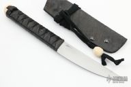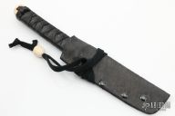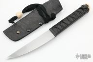 This knife by David Mirabile features a hand rub satin finished blade with .150" blade stock and 1.171" blade depth, hidden tang construction. The handle has black cord wrap over lightning strike carbon fiber with walrus ivory butt. Comes with a leather covered kydex sheath. Excellent condition. Really nice looking knife.