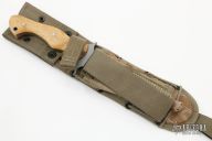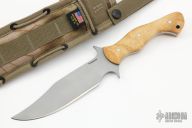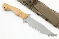 This "On Your Six" fighter with bead blast finished blade and integral double guard, full tang construction, .192" blade stock and 1.484" blade depth. Scales are spalted birdseye maple wood with stainless steel corby bolts. Comes with a Spec-Ops Brand nylon sheath. New from maker.