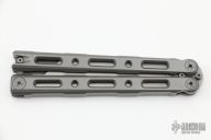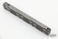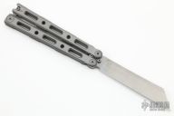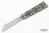 This Model 87 Balisong by Benchmade features a tumble finished wharncliffe style blade. The handle is comprised of an integrally constructed, skeletonized titanium frame with bead blast finish. Spring-loaded T latch on pommel. Comes with original box, papers and sheath. Excellent condition.
