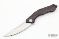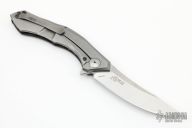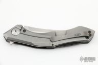This 0462 Sinkevich Design flipper by Zero Tolerance features a satin finished upswept blade with flipper and swedge. The handle has a red/black carbon fiber and tumbled titanium frame, black aluminum backspacer and a tip up reversible titanium clip. Nice detent, lockup and blade seating, rides on bearings. Has stainless steel lockface insert and overtravel stop, ceramic detent ball. S/N 6493. Excellent condition. Comes with original box and papers.