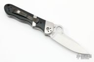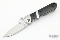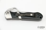 This Sub-Hilt by Spyderco features a satin finished blade with a thumb-hole, dual thumb-studs, and notched thumbrest. The handle has titanium bolsters, black G-10 scales, stainless steel liners, black G-10 backspacer, and 4-way reversible black stainless steel clip. Nice detent, lockup and blade seating. Comes with original box and papers. Excellent condition.
