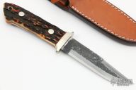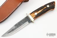 This Loveless Style Chute by Shosui Takeda and Masao Takahashi features Takeda's Aogami Super Steel (AS) which is a high-carbon steel alloy with vanadium and is ground on both sides. The blade has a false top edge, .146" blade stock and .951" blade depth, hidden/mortise tang construction. The handle and sheath are by Masao Takahashi. The handle has a nickel silver guard, a two-piece stag grip with red liners/spacers and nickel silver pins, lanyard hole. Great look and feel. Excellent work. This knife was made in 2012. Has a little patina on the nickel silver, otherwise excellent condition.