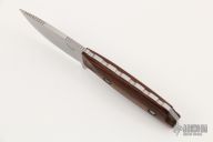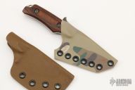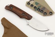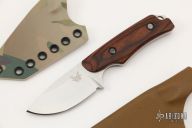 This fixed blade by Benchmade features a tumbled blade with a notched thumbrest and full tang construction. .140" Blade Stock. 1.169" Blade Depth. The handle features wood scales. Includes two kydex sheaths. Scratches are visible on the blade otherwise the knife is in excellent condition.