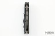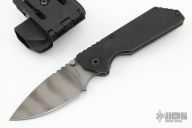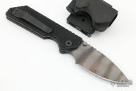 This early AR by Strider Knives features a tiger stripe blade with notched thumbrest and dual thumbstuds. The handle has black G-10 scales, tumbled titanium liners, and matching tip up clip. Comes with kydex sheath and teklok. Has some scuffs and scratches, otherwise excellent condition.