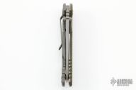 This 3.5" Spanto ground XM-18 from Rick Hinderer features a bead blast finish with notched thumbrest and flipper. Frag pattern green G-10 scale and bead blast finish titanium frame and pocket clip. Dual thumb studs and notched thumb rest. Reversible pocket clip. Strong lock up, nice detent and blade seating is center. Has scuffs and scratches throughout, otherwise good user condition.